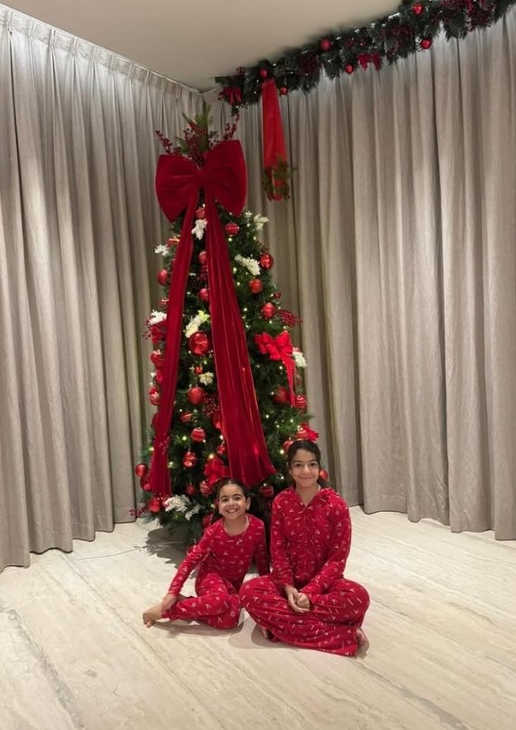 واللافت أن الصورة لم تظهره ولا زوجته، بل فقط تجمع ابنتيه مكة وكيان إلى جانب شجرة الميلاد.