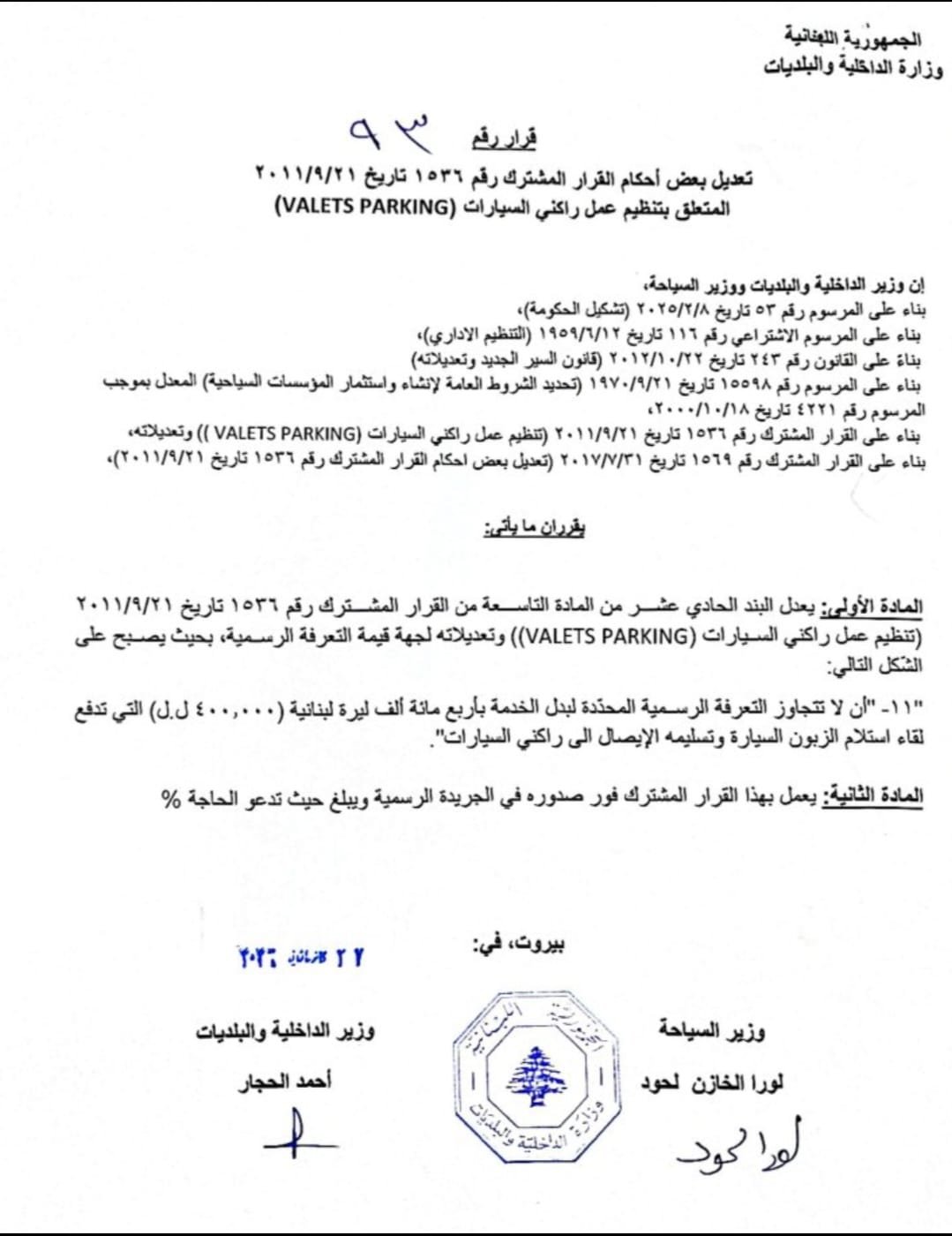 صدر عن وزارتي الداخلية والسياحة قرار قضى بإقرار تعرفة لخدمة ركن السيارات "الـValet Parking" لا تتجاوز الـ400 ألف ليرة التي تُدفع لقاء استلام الزبون السيارة وتسليمه الإيصال إلى راكني السيارات.