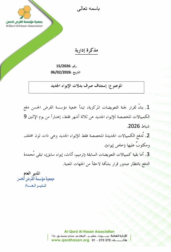 أعلنت جمعية مؤسسة القرض الحسن استئناف صرف بدلات الإيواء الجديد، وذلك بموجب مذكرة إدارية حملت الرقم 15/2026 وصادرة بتاريخ 06/02/2026.