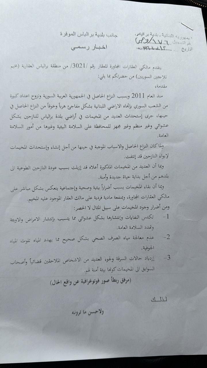 رفع أهالي بلدة برالياس كتابًا موقّعًا إلى البلدية، طالبوا فيه بإزالة مخيم للنازحين السوريين في سهل البلدة، معتبرين أنه يتسبب بتلوث مجرى نهر الليطاني.