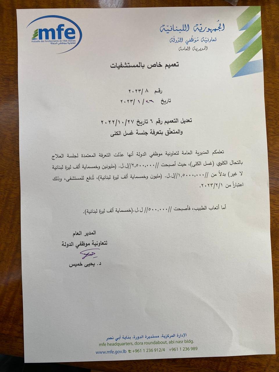 صدر عن "تعاونية موظفي الدولة" بيان أكدت فيه تعديل تعرفة جلسة "غسل الكلى" لتصبح مليوني وخمسمئة الف ليرة لبنانية بدل مليون وخمسمئة ألف ليرة لبنانية.