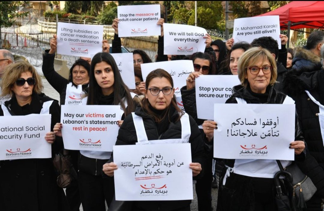 نفّذَ عددٌ من المعتصمين وقفةً تضامنيّة مع مرضى السرطان البالغين في لبنان، وذلك بدعوة من جمعيّة بربارة نصار، في ساحة رياض الصلح - مقابل السرايا الحكومية.