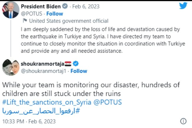 ردّت الممثلة السورية شكران مرتجى على تغريدة الرئيس الأميركي جو بايدن، الذي أعرب فيها عن حزنه الشديد للفاجعة التي حلت على سوريا وتركيا بسبب الزلزال المدمر الذي ضرب المنطقة فكتبت: "بينما يراقب فريقك كارثتنا، لا يزال مئات الأطفال عالقين تحت الأنقاض".
