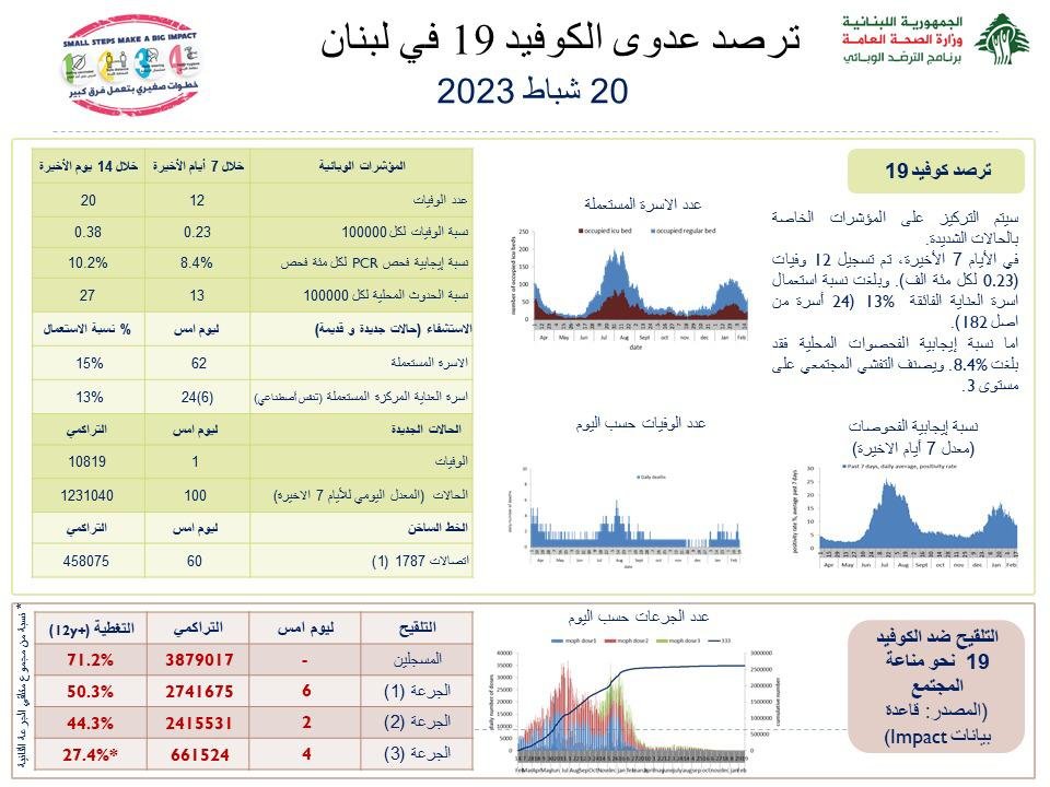 أعلنت وزارةُ الصّحةِ العامّة في تقريرٍ نشرته عن حالات كورونا تسجيل "100 اصابة رفعت العدد التّراكمي للحالات المُثبتة الى 1231040، كما تمّ تسجيل حالة وفاة واحدة"