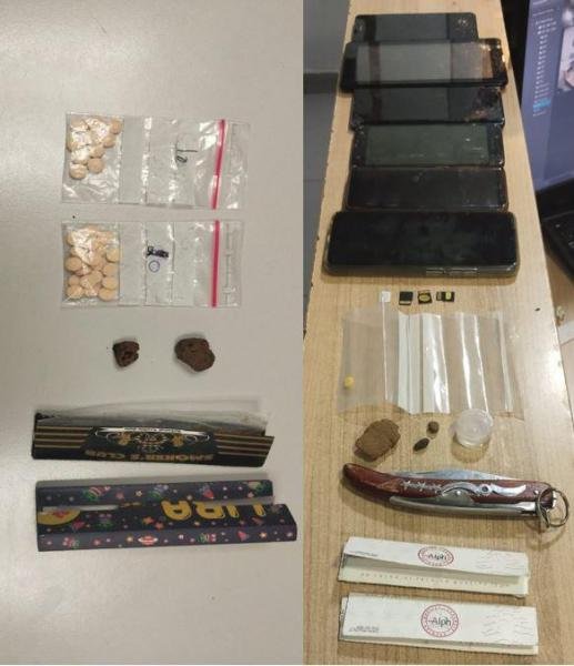 بتفتيشه والسيّارة التي كان على متنها، ضُبط بحوزته كميّة من حشيشة الكيف والكبتاغون، وسكين ست طقّات بالإضافة إلى /6/ هواتف خلويّة".