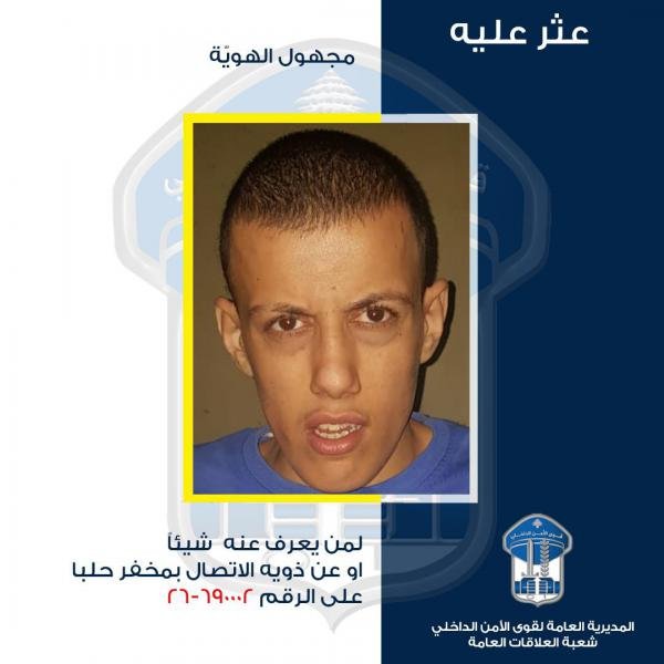عمّمت المديريّة العامّة لقوى الأمن الدّاخلي بناءً على إشارة القضاء المختص "صورة شخص مجهول الهويّة عُثِرَ عليه بتاريخ 26/10/2023 في محلّة ساحة حلبا- عكّار، وهو غير قادر على النّطق، ويعاني من خلل عقليّ، ولا يوجد بحوزته أيّ مستند يُعرِّف عنه".
