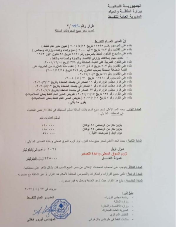 - المازوت: 570000 ليرة لبنانيّة. (+23000 ).